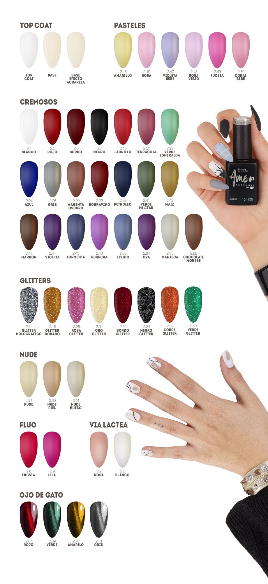 Producto de manicura que crea un efecto reflectante y tridimensional similar al ojo de un felino. Se logra utilizando esmaltes que contienen partículas magnéticas que, al acercar un imán especial a la uña húmeda, estas partículas se alinean formando una banda de luz brillante que puede variar su posición.